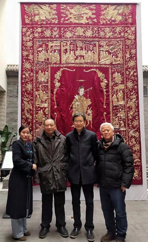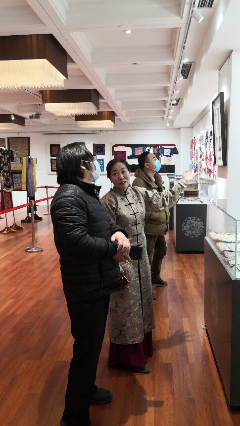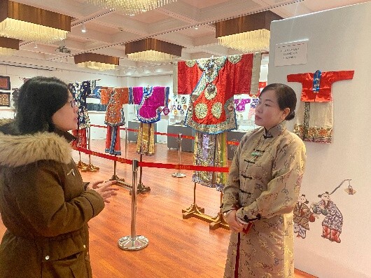 她对此次展出的珍贵文物可谓如数家珍,她介绍说这些展品涵盖服饰、家居、装饰艺术等多个门类,如清代打籽百子婴戏图刺绣斜襟服饰、清代宫廷缂丝小龙袍、宫廷缂丝玉兰衬衣、清代儿童五毒坎肩、婴儿老虎图案围涎、清代绛紫地盘金绣“麻姑献寿郭子仪祝寿”寿幛、红缎地福禄寿人物纹寿幛等等。通过文物的视角,解读中国传统家庭的文明发展历程,并以此为窗口,透视古代劳动人民对于美好生活的愿景和希望。这一件件饱经沧桑的文物,不仅记录了一段段直抵人心的故事、一个个引人深思的历史瞬间,也是中华优秀传统文化传承、家风传承的最好见证。因虎年将至,谭丽女士还特意挑选了绣有喜迎虎年新春的藏品进行展出,其中包括含有生肖虎、麒麟、狮子等神兽元素的百余件清代、民国、近代传统服饰及家居装饰艺术丝织刺绣品。