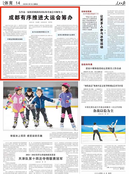 1月7日,《人民日报》关注成都大运会,刊发了《成都有序推进大运会筹办》的文章,报道了成都正在全力做好成都大运会各项赛事筹备工作。文中提到,距离成都大运会开幕还有不到半年时间,成都正全力做好各项赛事筹备工作,随着执委会组织进行了首次模拟综合演练,成都已经做好了迎接盛会的准备,为举办一届精彩圆满的国际体育盛会不懈努力。