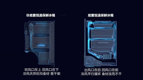 首先,针对用户提出冻肉口感干柴的痛点,底置恒温保鲜科技解决了背后元凶——“冷风直吹”。由于风口设计的问题,传统风冷冰箱制冷时,产生的风会直接吹入冷冻室内,而底置恒温保鲜科技将出风口后置,回风口前置,达到冷风绕开食材的目的,做到了冻而不干,锁住食材水分。