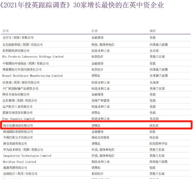 2月24日,全球领先的审计和咨询组织Grant Thornton与英国中国商会、《中国日报》联合发布了《2021年投英跟踪调查报告》,并公布了30家在英国发展最快的中国企业。其中,海尔智家上榜,居同类企业第一。