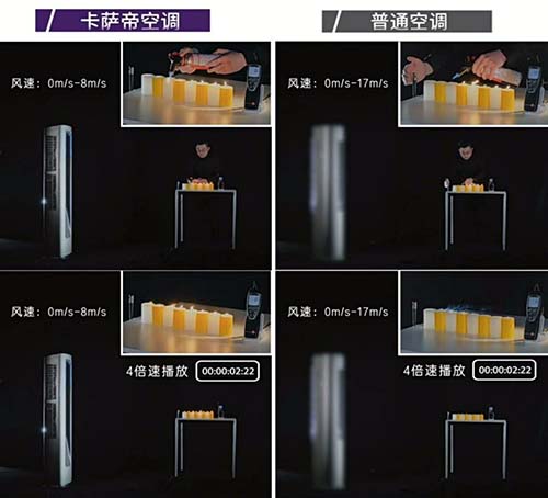 要知道,蜡烛这么小的火焰,想让它熄灭,也就是一口气的事儿,更何况是在启动的空调前。可为什么卡萨帝空调前的一排蜡烛能坚持这么久呢?这还是要看两台空调在送风科技的差异。