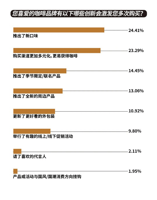 这届年轻人追求个性化多元体验,所以除了产品创新,联名款、季节款等限定产品系列,也是激发他们购买力的重要驱动。南方都市报发布的95后咖啡消费调研结果显示,针对喜爱的咖啡品牌,激发95后多次购买的因素中,“推出了季节限定/联名产品”、“推出了全新的产品周边”、“更新了更好看的外包装”,排名占到第3-5位。而瑞幸不仅拥有樱花季等季节限定产品系列,此前更与LINE FRIENDS、CRAIG & KARL、冯唐、潘虎等品牌和艺术家跨界合作,持续收获年轻人追捧也就不足为奇。