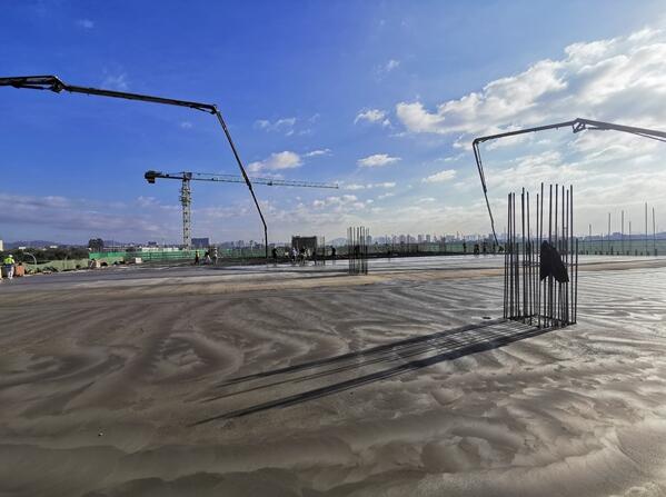 2020年8月,在疫情防控和高温酷暑的双重压力下,项目进入高大支模施工阶段,其中最大跨度为22.8米,最大梁横截面为1.2*2.8米,整体需要搭建约75万立方米的高大支模架体,超长的跨度、超大的梁截面尺寸及庞大的架体体量为施工带来不小难度。为确保按时完成施工任务,项目部在做好防暑降温措施及常态化疫情防控的同时,迅速调整施工计划及施工工序,一方面加大高大支模相应材料的投入,另一方面采用“先架梁、再穿插”的施工方法,4个分拣中心库房同时进行流水施工,高峰期时高大支模投入量达20万立方米,不仅有效解决大截面梁箍筋绑扎难、施工速度缓慢的问题,保障施工进度,更为后续施工奠定了坚实基础。