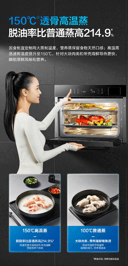 在传统中式烹饪中,“蒸”已经是大众眼里较为健康的烹饪方式。但是老板电器作为深耕厨电领域43年的龙头企业,不断在烹饪方式中进行着突破,力求把更好的烹饪方式和更健康的美食传递给大众。就拿老板轻脂烹饪机CQ9161来说,在“蒸”这一常规功能上,老板电器也用自身实力进行了加持与突破。仅从温度这一点来看,老板电器就把此前行业最高125℃提高到了150℃高温蒸。