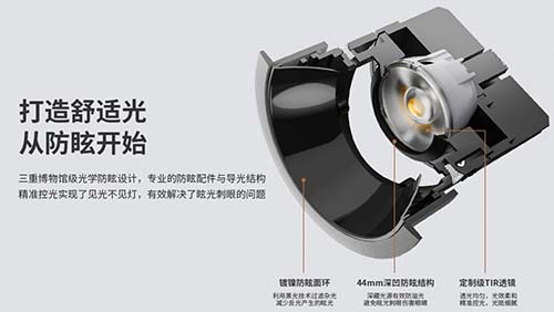 ES52射灯防眩指数UGR小于13趋近专业级标准,以44mm筒深藏住光源避免直射刺眼,配置镀镍防眩环有效吸取眩光杂光,搭配特定制光学级TIR菱格纹透镜,使出光均匀柔亮不刺眼。实现“见光不见灯”防眩效果。