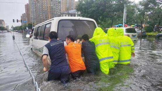 在救援一线,平安理赔员主动配合当地市政、交警,在积水路段驻扎、提示过往车辆注意安全。平安查勘车纷纷贴上“积水地带,谨慎出行”的醒目条幅与车主一起抢救水淹车辆,守护每一位车主的出行路,降低人民群众的财产损失。