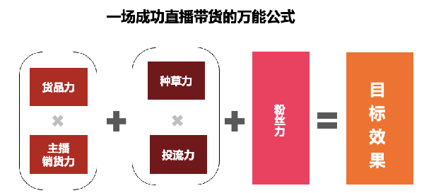在《新消费下半场,品牌新增长机会在哪》演讲中徐扬表示,微播易研究了1W场直播,3000多个品牌,并利用了POES方法找到了一个成功直播带货的万能公式:(货品力x主播销货力)+(种草力x投流力)+粉丝力=目标效果。