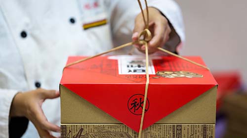 在“彰德锦泰恒糕点”生产车间,工作人员用传统纸盒、纸绳包装月饼