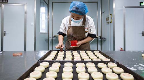 在“彰德锦泰恒糕点”生产车间,工作人员在给月饼加盖“五仁”戳记
