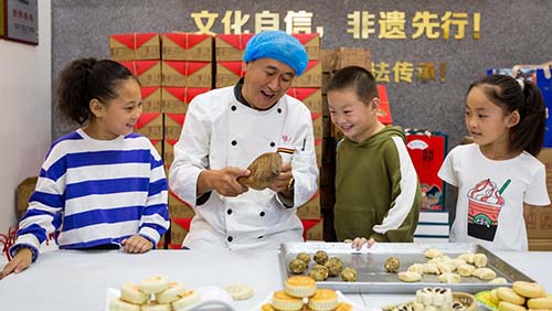9月3日,河南省老字号、安阳市非物质文化遗产“彰德锦泰恒糕点”传承人冯超(左二)在向小朋友讲解月饼的制作工艺。