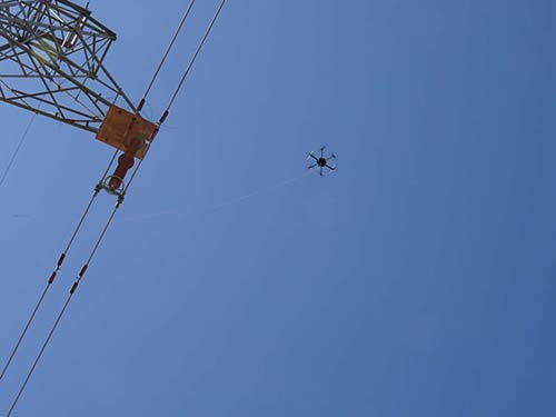“无人机检查完毕,一切良好,可以起飞。”在工作现场,无人机飞手认真检查无人机状态,确认运行状态良好后,操控携带绝缘牵引绳的无人机起飞,飞越导线上空到达预定的抛投点,将绝缘牵引绳抛挂在330千伏盘清I线13号右相(A相)导线上,无人机飞出设备区降落至安全地界。