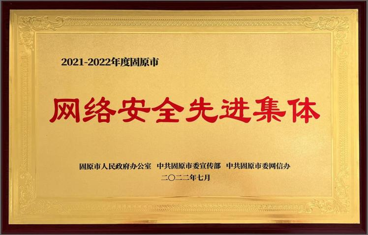 7月28日,国网固原供电公司被固原市人民政府办公室、固原市委宣传部、固原市委网信办联合授予“2021-2022年度固原市网络安全先进集体”称号。