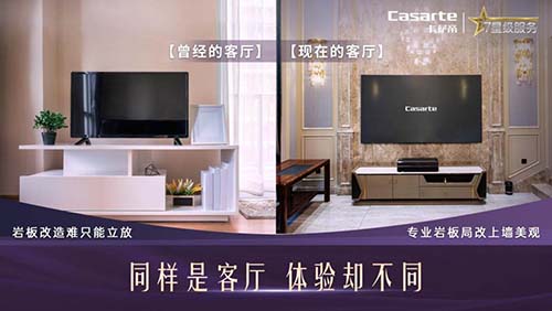 同样是客厅,曾经的客厅岩板墙造价高改造难,电视基本只能立放,而卡萨帝针对岩板墙提供专业改造,无尘打孔专用螺丝加固电视,安装效果美观大气。