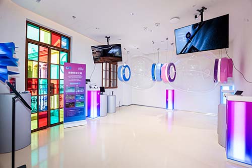 首家线下体验中心坐落于静安区的张园·丰盛里——一个融合历史风貌和海派文化的黄金商业街区。体验中心占地673平方米,三层体验空间涵盖了口腔健康、男士理容、美容美姿、母婴健康、呼吸健康等多个关护场景,共分为八个主题空间——沉浸式空间、VR体验馆、母婴室和育儿区、尊享定制区、男士剃须刀艺术装置、沙龙专区、口腔健康区和睡眠体验区。每个空间都各有特色,兼具科技酷感和艺术美感,拥有丰富的产品展示、沉浸式体验、个性化定制、跨界活动和专业服务。其中,位于二楼的“健康奇迹之旅”(The Wonder of You)VR体验包括六个情景,参观者可以身临其境探索人体神奇的微观世界,了解身体更健康的奥秘。