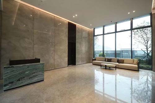 移步换景,来到了楼栋首层,自动感应的玻璃大门缓缓打开,精心挑选的浅色石材从玻璃门一直往内延申,从墙上至电梯间,为归家的业主拉满了仪式感。