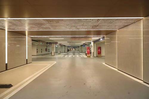 细节远不止于此,小区住宅首层的无障碍坡道栏杆还由不锈钢栏杆升级为玻璃栏杆,塔楼裙房外围铝合金栏杆也都提升为玻璃栏杆。为了增加回家仪式感,半山臻境除了架空层的优化设计,地下停车场装饰更是不计成本。格栅吊顶覆盖全车道,从进停车场入口就一直延申到各单元,暖黄的灯光透过电梯间前落客区的穿孔铝板吊顶,仿若点点星光散落在回家路上,指引着回家的方向。