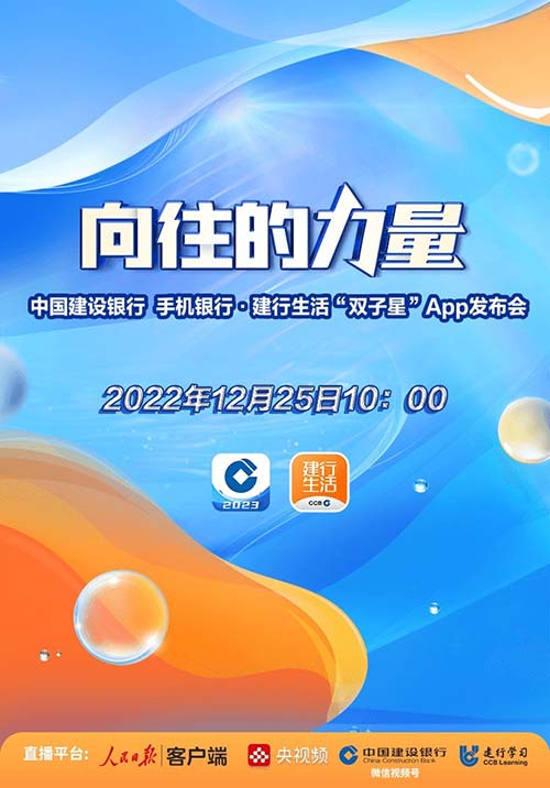2022年12月25日上午10时,中国建设银行召开“向往的力量——中国建设银行‘双子星’App发布会”。发布会通过“中国建设银行”微信视频号、建行学习App、人民日报App、央视频App、央视频抖音号、央视频官方微博等平台同步播出,向社会公众隆重推出手机银行2023,并发布“建行生活”全新升级品牌。