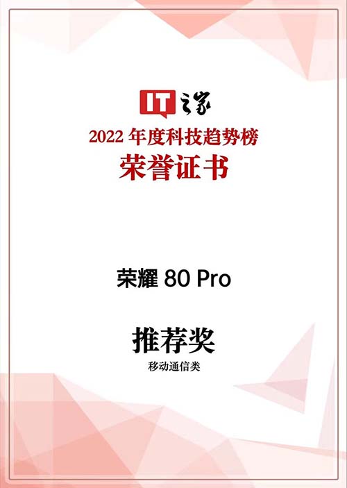 “IT之家 2022年度科技趋势榜”自 2022年 12月启动以来,以客观视角汇集万千读者口碑和消费选择,经层层筛选,评选出 2022年度好产品。荣耀80 Pro再度突出重围,被《IT之家》授予2022年度“移动通信类推荐奖”。