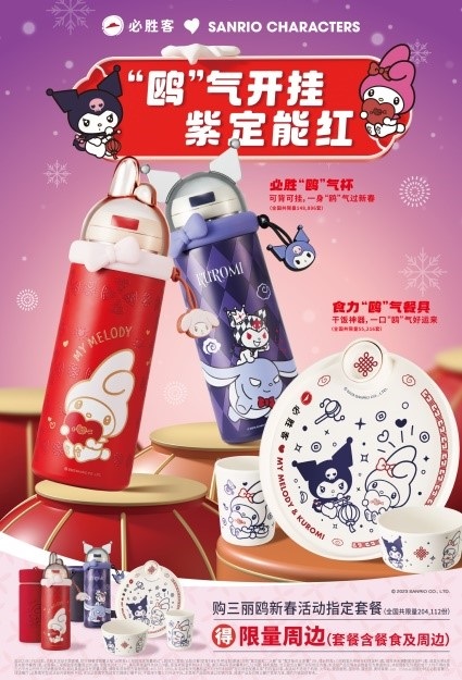 与此同时,必胜客与三丽鸥旗下人气最高兔子IP—美乐蒂&库洛米,在2023年开年推出3款独家定制新春周边,打造应景兔年的新春限定周边,在春节及寒假吸引亲子家庭及年轻人一起大过新年。