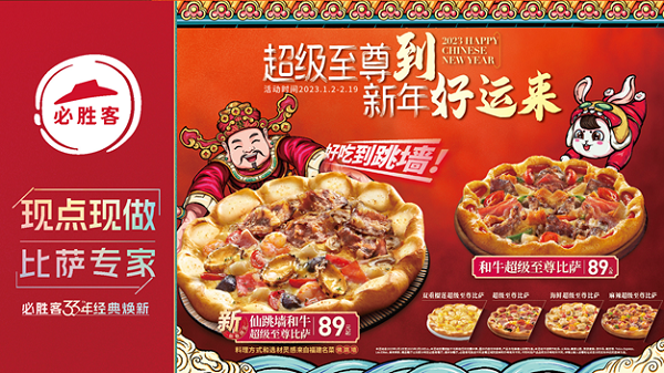 此外,在“超级至尊到,新年好运来”主题促销活动中,必胜客不仅与30年经典情景喜剧IP《我爱我家》合作,共同推出拜年短片,还与芒果卫视0713男团深度合作新春歌曲《超级至尊到,新年好运来》,送出新年满满祝福,寓意2023年辞旧迎新,开启好运新年。