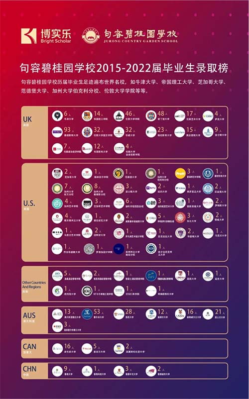 十年来,句容碧桂园学校在国际教育道路上持续探索奋进,取得了丰硕的成绩。历届毕业生足迹遍布世界名校,如牛津大学、芝加哥大学、加州大学伯克利分校、范德堡大学、纽约大学、伦敦大学学院、多伦多大学、香港大学等等。