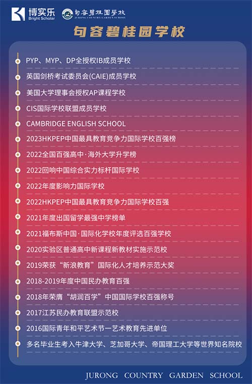 句容碧桂园学校2013年办学,2014年成为英国剑桥考试委员会(CAIE)成员学校,2015-2016年间成为PYP、MYP、DP正式授权学校,2016年还成为了15年一贯的剑桥英语学校,目前在校生2700多人。