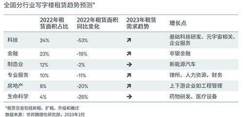 受益于宏观经济刺激措施的金融、行业政策环境改善的科技互联网和房地产,以及防疫优化和经济复苏利好的下游服务业的写字楼需求有望出现明显提升。其中,金融和科技将继续担当写字楼租赁需求的主引擎。受外资对中国市场长期信心的利好,制造业仍具增长势能。