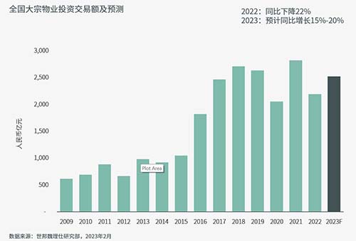 2022年中国大宗物业投资总交易额累计2200亿元,同比下降22%。随着防疫政策优化“新十条”和一系列提振经济举措接连出台,投资者情绪将明显改善,预计2023年中国商业地产投资市场全年交易额超2500亿元,同比上涨15%-20%。