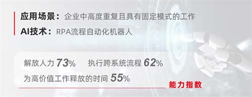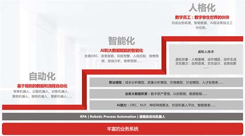 不同于阅读、聊天、搜索等面向终端用户的应用场景,人工智能在企业级领域的应用更具复杂性。在这一过程中,从早期依托RPA技术实现基于规则的数据和流程自动化,到借助OCR、NLP、算法模型等实现AI和大数据赋能的智能化,再到基于虚拟人技术的数智员工的诞生,AI技术在企业领域的应用历经自动化、智能化、人格化的发展过程。