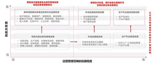 相对于上述的信息化、流程驱动方式,企业数智化的过程是更加深入企业业务前端、由一个个业务场景驱动的信息技术应用与变革,一方面,以数智技术重塑原有业管场景,实现内部运营管理的数智化;同时,针对原有信息化薄弱的场景环节,以数智技术进行改造提升,实现便捷的创新业务场景孵化,以及从内到外的运营管理范畴的拓展。这些经过重塑、创新的场景原则上不同于“表单+流程”驱动的方式,而是以数据驱动的“作业场景”为核心载体,呈现一种全新的场景范式。