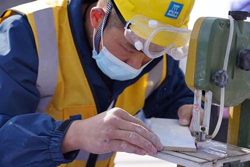 钻入了镶贴的“牛角尖”里,童林如鱼得水且难以自拔,从此以后几乎是年年都能帮扶项目进行一两个工艺上的改革。“阴阳角倒角,乍看是一个很不起眼的细节,但却最能够反映出一个工匠的技术水平来。”参与到全国技能大赛集训中的童林敏锐地发现了这一点,许多选手都没有做好的倒角工艺,童林下了苦工,为了保持高标准训练,他会先把新买来的磨光片用个三五回,顺手了以后才会在训练的时候使用。童林的钻研劲儿驱使着他把镶贴技术做到精细入微,也正是因为如此,无论是训练还是比赛,亦或者在生产一线,他所经手的作品总是能在细节上独领风骚。