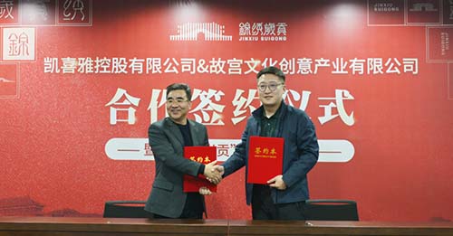 凯喜雅控股有限公司总经理、重庆丝数零境公司董事长刘光芒与故宫文创研发交流中心负责人郭家雄出席现场并签约。