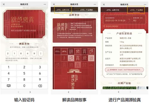 “锦绣岁贡”品牌的保真溯源系统,利用先进的区块链技术严格把控丝绸产品每一个流程关键点,在产品吊牌上加装智慧芯片,确保每一件产品在出厂前都有据可查且真实可信,并最终通过手机触碰或扫码的方式显示在用户终端上。对产品进行数字溯源的管理,可以在一定程度上避免流通环节造假的可能性,确保供应稳定、价格稳定,给予消费者一个放心、安全、信任的消费环境。