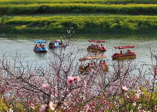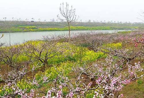 阳春三月,春意盎然。西华县黄桥乡颍河两岸万亩桃花竞相开放,金灿灿的油菜花、绿油油的麦苗相映成趣,红、黄、绿构成了五彩缤纷的人间仙境,置身其中,花香沁人心脾,色彩绚丽,绵延似锦,犹如陶渊明笔下的桃花源。