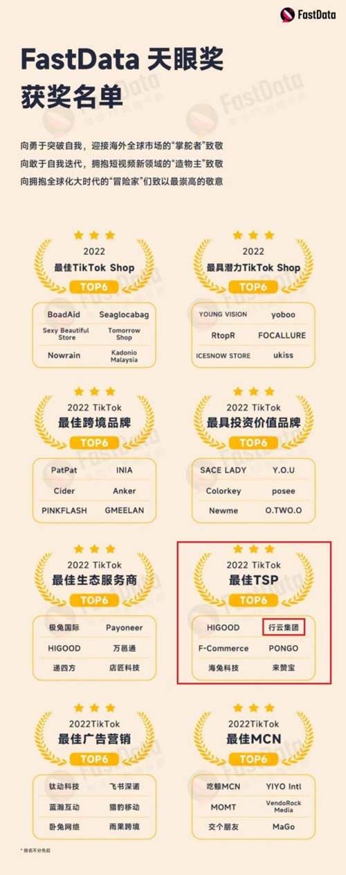 近日,第三方平台FastData研究院正式发布了行业报告《2022年度TikTok生态发展白皮书》。同时,白皮书还同步发布TikTok生态首份第三方最具影响力的奖项TikTok天眼奖及TikTok生态图谱。行云集团凭借2022年度在Tiktok出色的表现斩获“最佳TSP”荣誉。