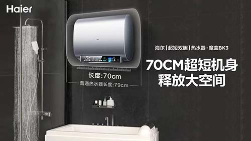 3月末,海尔「超短」扁桶热水器BK3的上市,彻底解决了这个问题。这款热水器的长度仅有700mm,是目前行业内同类型产品中长度最短的,小浴室也不用担心装不下。纤小的体积并不意味着小水量,双胆速热科技能保障120分钟内持续输出热水,即使是8口之家也不用担心热水不够用。