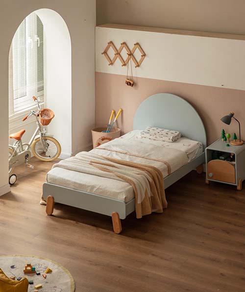 功能上,半圆形高床头,打磨圆润,倚靠舒适;床头置物板设计,方便拿取绘本读物;床头背板多重加固,防止变形,稳固耐用;床头板直达铺板下方,不吝用料,能够适配各种厚度床垫。纯实木材质+木蜡油涂装,环保健康,守护孩子的纯净睡眠。