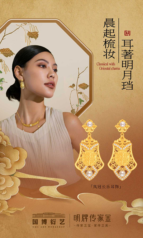 2022年,明牌传家金与中国国家博物馆旗下文创品牌-国博衍艺,合作开发国匠系列珠宝,从典藏文物中获取灵感,将蕴含华夏文明图腾元素以珠宝呈现,匠造现世臻品。文物穿越千年,与现代潮流碰撞,相连古今时空,让世界了解独特的东方华韵之美。推出凤冠长乐、令仪倾城、凤凰于飞、吉语开运等系列产品,开创IP合作新里程。