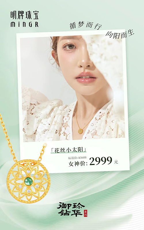 除了“优”系列,明牌珠宝旗下的独立品牌“传家金”将薪火相传,连绵不断的“家”文化融入饰品当中,运用古法黄金技巧打造了一系列传家珍品,比如系列中的爆款单品“花丝小太阳”,黄金打造的太阳造型中间嵌入祖母绿,凸显春日雅韵之美,颇受消费者喜爱。