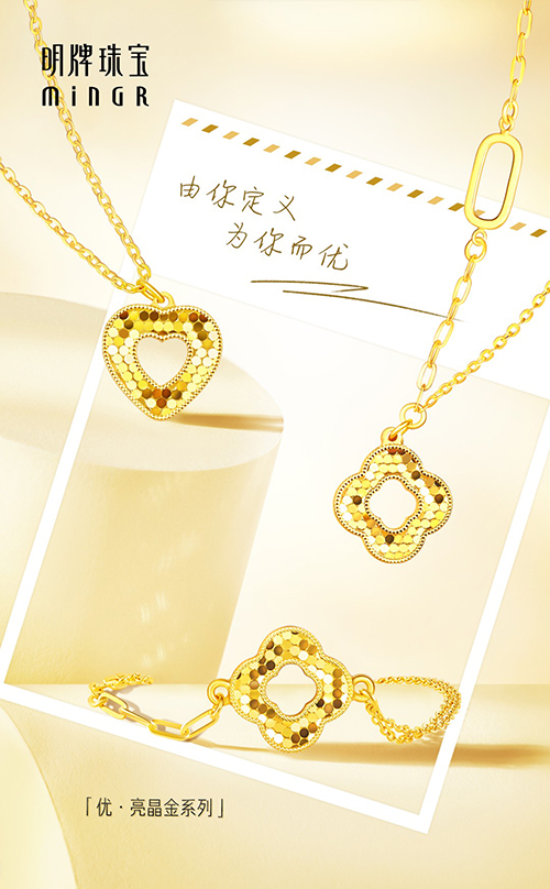 在探索过程中,明牌珠宝的设计团队发现随着我国文化建设力度加大,消费者一边希望饰品风格展现时代新女性优雅、独立、强大,一边又青睐花丝镶嵌等古法黄金制作工艺呈现的艺术效果。为了满足消费者需求,明牌珠宝不断推出具有时尚气息、轻奢格调的新品。主打现代时尚感的系列饰品“优•亮晶金”以心形、四叶草形为轮廓,延续“优”系列的经典符号美学,高级感鎏光风情闪耀,演绎个性风采。