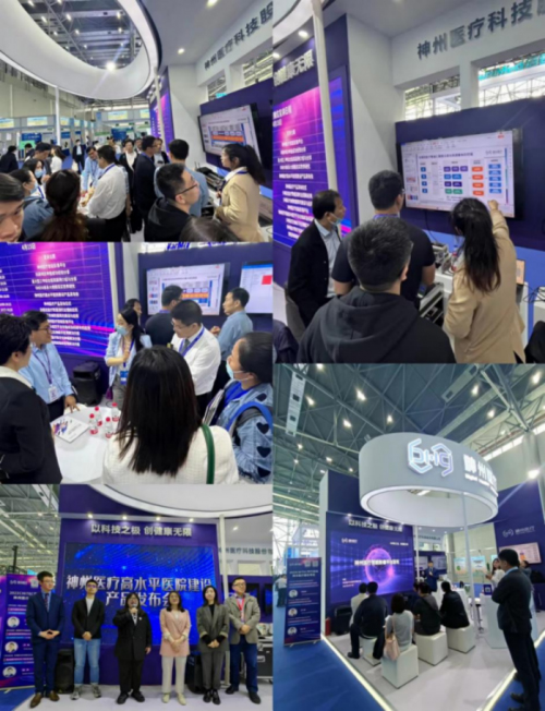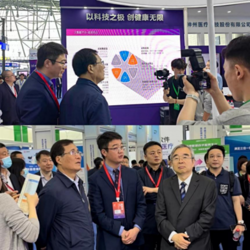 (中国卫生信息与健康医疗大数据学会会长金小桃、国家卫生健康委规划发展与信息化司司长毛群安莅临神州医疗展位视察指导。)