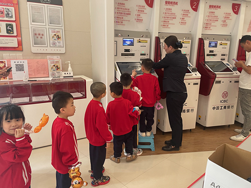 该支行工作人员带领小朋友们参观并讲解了营业厅各个区域的功能。小朋友们亲身体验从开门迎客到引导客户办理业务的全流程服务,并使用点钞练功券点钞,切身的实践体验使小朋友们真实感受了新时代的智能银行,拓展了孩子们的视野。