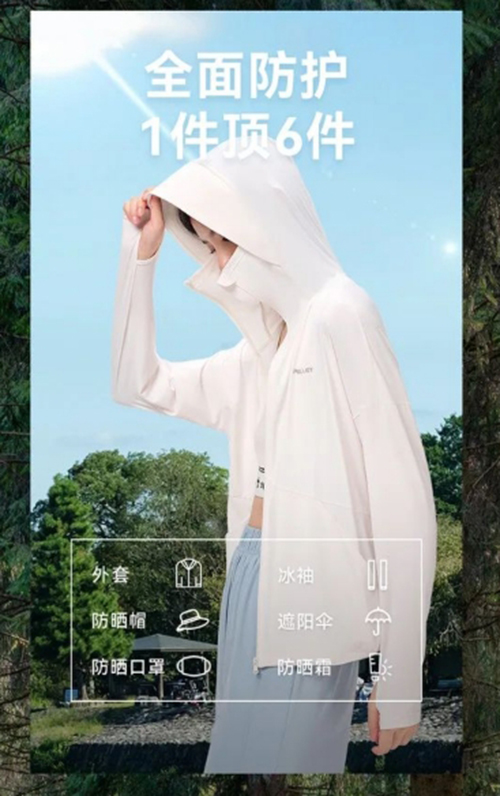 同时,“小光盾”防晒衣兼顾外套、防晒帽、防晒口罩、冰袖、遮阳伞、防晒霜六大防晒功能,全面防护每一寸肌肤,真正做到1件顶6件的高效防晒装备。