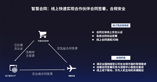 首先是在效率提升方面,由线下人工参与合同打印-审批-往返邮寄-签字-盖章-归档,转为全流程线上进行,15-21天的合同签署周期缩短至3-5天,甚至最快的时候几分钟就能完成签署。