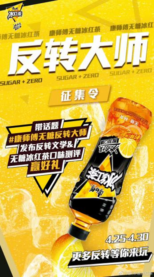康师傅无糖冰红茶吸引年轻人的动作,不仅体现在传播的态度和内容上。为了与消费者进行深度互动,增加消费者体验感,康师傅在微博平台发起#康师傅无糖冰红茶反转大师#活动,联合了20家各行业品牌,邀请粉丝及消费者分享生活中的反转故事,用反转梗分享口味测评,造就了一场声量破亿的“痛快反转”活动,引发新生代消费者的持续关注。