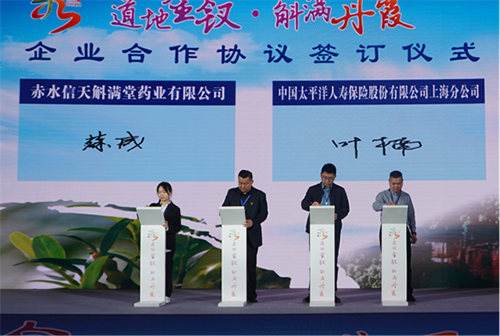 赤水市人民政府与中国中药协会签订关于支持石斛产业发展战略合作协议,签订产学研合作协议,签订一批招商引资项目。大会现场,信天药业销售公司总经理蔡威与浙江绿城新零售科技集团有限公司、中国太平洋人寿保险股份有限公司上海分公司、北京中瑭科技有限公司开展“分享健康、助农振兴”战略合作签约,为金钗石斛产业提质增效,助力乡村振兴。