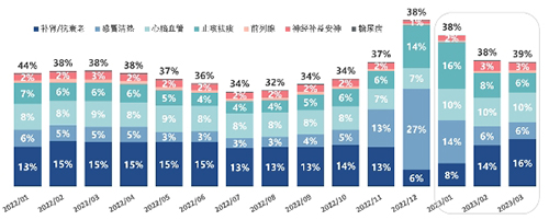 2022-2023Q1中成药零售电商市场7大重点功效份额月度走势