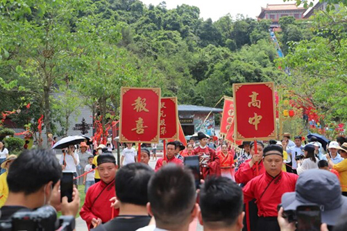 观音山特别邀请了状元郎来到现场。活动现场还原了古代金榜题名时衣锦还乡的场景,头戴状元帽,身披状元袍佩红花,前呼后拥,锣鼓开道,侍卫开道,气势非凡。