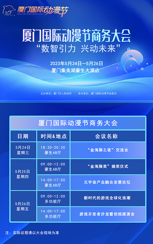 由厦门国际动漫节组委会主办,厦门信息集团创新软件园管理有限公司、厦门地心互娱网络科技有限公司承办的“2023厦门国际动漫节商务大会游戏产业论坛”将于2023年5月26日在厦门集美湖豪生大酒店多功能厅正式举行,各界游戏精英将再次汇聚鹭岛。