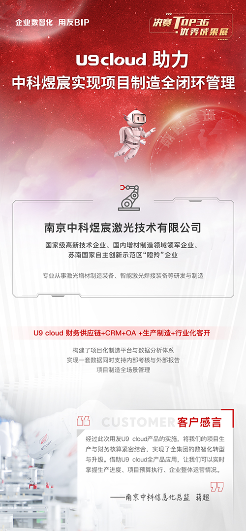 从2020开始,在新目标的牵引下,中科煜宸开始重新选择信息化服务商,能满足企业多组织管理、项目化生产,且产品架构领先、参数设置细化的产品成为他们的首选项。经过严格的筛选,他们最终选择了国内领先的数智制造创新平台——用友U9 cloud,该平台架构统一、柔性、可扩展,是项目型制造企业的首选。